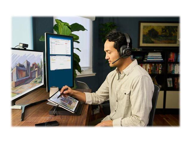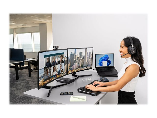 Kensington H3000 Bluetooth Headset tilbyr en oppslukende og fokusert opplevelse, trådløs frihet til å bevege deg og eksepsjonell lydteknologi. Øreputer av minneskum med kjølende gel gir komfort hele dagen, AI-drevet omgivelses-støykansellering fjerner distraherende lyder, LED-indikatorer bekrefter status og reduserer forstyrrelser, musikkontroller med teknologi for samtaleregistrering forenkler overganger og sidetone gir et bedre samtaleengasjement. Dynamiske 40 mm neodymdrivere gir en overlegen lydopplevelse for samtaler og musikk. Det langvarige batteriet med hurtigladeteknologi gjør at du kan bruke headsettet mens det lades. H3000 er en del av Kensingtons profesjonelle økosystem for videokonferanse - og sørger for en integrert opplevelse slik at du bruker mer tid på å være produktiv.
