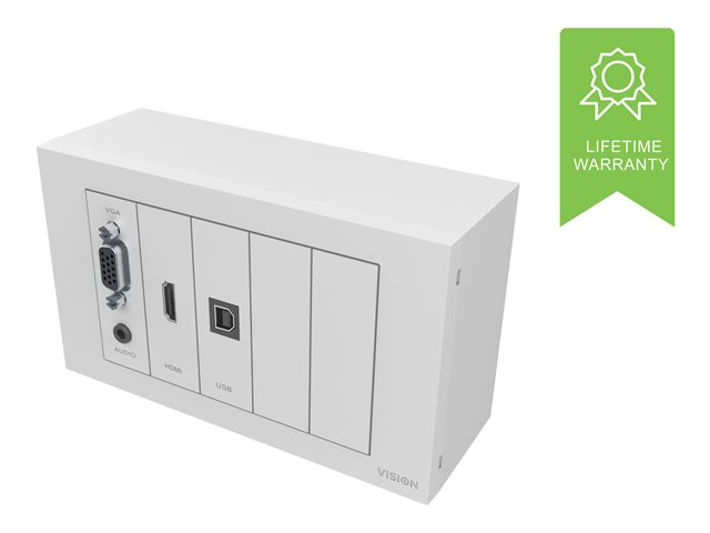 A "surround" which comes in two parts fits to a backbox (or "mudring" if your wall is hollow), then the modules fix in place to complete the installation. Techconnect is based around standard UK backbox sizes, and Vision also offers mounting hardware for other countries.