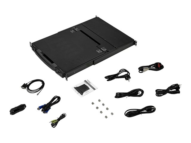 This KVM console comes with everything you need to set up: 1 Audio Cable; 1 Set of KVM Cables (USB/VGA); 2 Rear Mounting Brackets; M5 Cage Nuts and Screws.