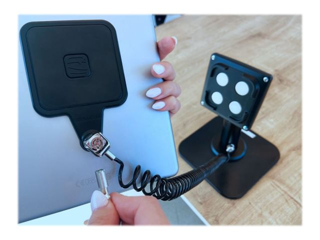 Bring flexibility to your business and checkout process with this unique tablet solution. Securely dock any tablet to an elegant pole stand while being able to freely remove it and benefit from extra mobility and in-store efficiency. Dock and undock your tablet in a snap! Energize the shopping experience with exciting customer-staff interactions and generate upsells with additional product information and personalized suggestions. The slim and strong Universal Tablet Magnetic Mount combines an adhesive metal plate and a proprietary design VESA magnetic plate on a Rise pole stand. The adhesive metal plate can be easily added to the back of any tablet brand and size. It includes a cable lock slot to keep the tablet safe when removed from its base. Its stylish design makes it discreet when the tablet is used off stand, and does not interfere with the user's experience. This extra mobility makes the stand ADA (Americans with Disabilities Act) compliant by facilitating interactivity and access to the tablet by any person with disabilities. The VESA magnetic plate has 4 heavy duty magnets and a special design allowing it to perfectly display the tablet both in portrait and landscape modes. The strong materials are designed to be used even in high traffic venues making the installation durable for intensive daily use and unlimited docking/undocking. The Rise pole stand has wire through cut-outs for clean cable management and a screen tilting feature for maximize customer engagement. The Dual head coiled cable is a must to secure the tablet to the stand for hassle-free use, keeping all excess cabling tightly wound. Made of slim galvanized steel, it has low-profile 180-degree rotating cable connections that move freely while the tablet is manipulated by the user for a smooth experience, while the 180-degree rotating T-bar head locks make it easier to lock and unlock. In environments such as retail stores, trade shows or restaurants, the tablet can be unlocked and stored safely or placed in a charging and synchronizing cabinet, for hassle-free fleet management. Add extra protection by selecting a Silicone Rugged band for your tablet.